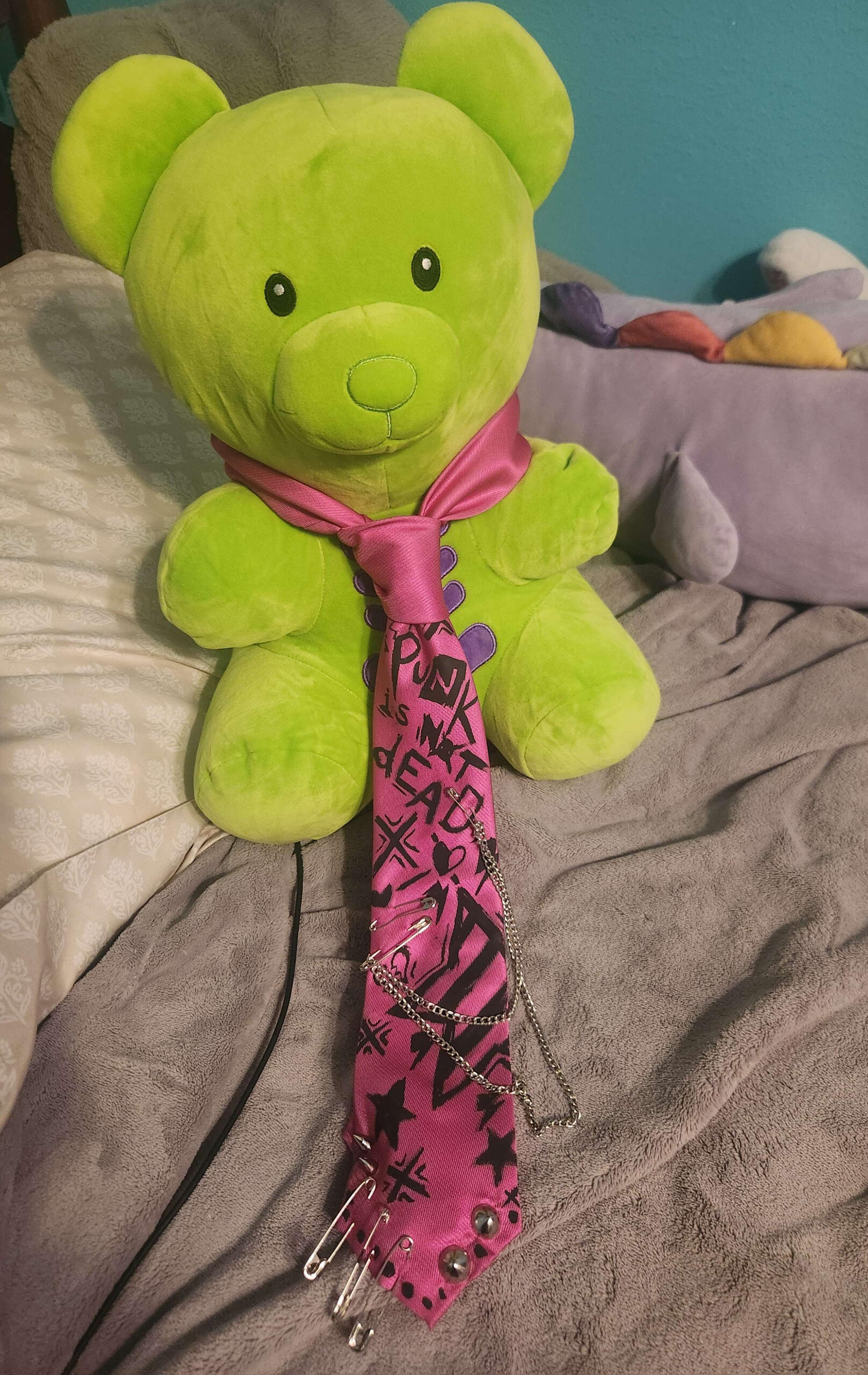 Modelled here by my new, and very cuddly friend, Gomi. We did a Hannah Montana tribute set and I really wanted to lean heavy into the alt look from the early 2010s. Originally, I planned to wear all white and black, and I went thrifting with a friend of mine to look for a white tie. I couldn't find any plan white ties, but I found this bright pink one that instantly caught my attention. One does want a hint of colour!This was the total stand-out, statement piece of my look. I just really wanted to go ham with the hardware and, in retrospect, I should have done the illustration work before attacking it with safety pins and studs.It really made me miss when I had a lot more free-time to upcycle and make my own clothes. I truly miss doing it, and the last few times I have had to get out my sewing machine for anything or crochet for hours on end, I've had a total blast.